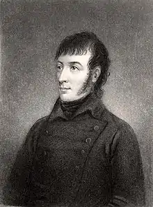 The physician James MacDonnell, who had warned Russell that if he returned to Belfast he would find "a great difference in this place", subscribed 50 guineas to a public subscription for arrest.[43] He later claimed that he had done so dispel suspicion of his own sudden departure from Belfast, a result of his being called away to perform an operation. They had been friends: MacDonnell had allowed Russell to lodge with him from October 1792 to February 1794 and, with Drennan, had helped him get the position at the Linen Hall library. He had corresponded with him while in Newgate (where Russell was treated by MacDonnell's Dublin counterpart and friend, Dr. Whitely Stokes).[44] But MacDonnell had always taken issue with Russell's militant republicanism, suggesting that, just as in their shared scientific interests, his judgement in politics was often rash and, in working "all from first principles", naive.[45]