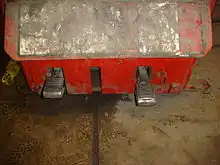 The mount/demount mechanism consists of the duckhead, swing arm, and vertical slide. The duckhead is at the bottom end of the vertical slide. The duckhead is uniquely shaped, like a tapered bill, to fit next and surround the rim of a wheel. It can either be made of metal or plastic. The duckhead mounts and demounts the tire from the wheel.[2] The swing arm moves left and right. The purpose of the swing arm is to move the duck head near or away from the rim. The last component of the mount/demount mechanism is the vertical slide. The vertical slide moves up and down so that the duck head can fit onto the rims of different size wheel widths. The vertical slide has a spring and locking handle above the swing arm to set the duckhead and maintain a stable position around the rim.[2]