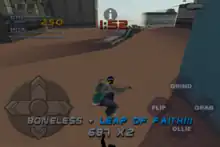 In Tony Hawk's Pro Skater 2, the player character is self-propelling and can have their course altered via the arrow keys or d-pad. The player character is capable of jumping and change direction midair. The game features a vast number of skateboarding tricks.[12] One button can be used to switch footedness between "regular" or "goofy", while another can initiate a nollie or a fakie. Passing from a nollie to a fakie (or vice versa) in a chain of tricks increases the multiplier factor of the score collected for that chain. Other button inputs can be used to perform slides, grabs, and flips. A series of inputs can be used to perform lip tricks. It is possible to perform wall rides and transfers (changing ramps) as well as manuals that allow several tricks to be chained together.[11] The player must use directional input to maintain balance during a manual; in the 2X port, balance is visually represented by a vertical scale that appears next to the player character.[13]