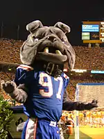 Some might say it's a coincidence that the two biggest wins in the program's Division I-A history had been decided in the south end zone under the watchful eyes of the Spirit of '88. However, the third time proved it was more than just chance. On a warm October 2 evening in 2004, Louisiana Tech found itself trailing No. 17 ranked Fresno State 21-20 late in the fourth quarter. Fresno State had the football and the momentum, trying to move out of its own end zone—the south end zone—against a Tech defense and its 12th man, or should we say Dawg. However, under the watchful eyes of the Spirit of '88, the Tech defense and offense would both strike. On third down Fresno State quarterback Paul Pinegar was intercepted by Byron Santiago who returned the football down to the 16-yard line. Two plays later, Ryan Moats gave Tech a 28–21 lead and the eventual win as he rushed eight yards to the right corner of the south end zone. The Bulldogs had defeated the 17th-ranked team in the nation. A Joe Aillet Stadium crowd celebrated wildly with the Tech players, coaches and the Spirit of '88. Some may say the powers of that bronze Bulldog are a fluke. Tech fans won't agree. The numbers say 59 wins and just 20 losses since the Spirit of '88 was unveiled. So fluke or not, the Bulldogs will continue to touch it each home game and hope the wins continue.[9]