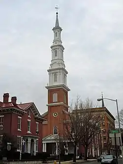 Trinity Lutheran Church is a historic Lutheran church at 6th and Washington Streets in Reading, Berks County, Pennsylvania. The current church building was built in 1791, and is a two-story, three bays by five-bays, red brick building with stone and wood trim in the Georgian style. The second floor was added in 1851. It has a square bell tower and steeple last replaced in 1963. The front facade features a columned portico added in 1900.[2]