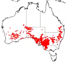 Triodia scariosa occurs throughout semi-arid and arid regions of mainland Australia south of ~24o latitude (excludes Northern Territory and Tasmania) and mostly within a mean annual rainfall of 200-400mm.[5][6] The species occurs in its highest abundance in the Mediterranean-type climate of the Mallee ecosystem found in south-western Western Australia. South Australia and western Victoria.[13][14] Although T. scariosa occurs in hummock grasslands (MVG20) of the arid interior, it is at much lower densities.[14] The increase in abundance, and growth, of the species in the semi-arid Mallee ecosystem is due to increased rainfall and the presence of yellow sandy soils (compared to the red sandy soils of the arid interior).[14]