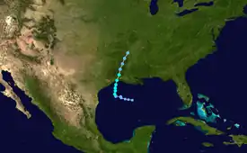 In post-season analysis, it was indicated that Tropical Depression Five strengthened into Tropical Storm Chris at 1200 UTC on September 10. Due to a large low pressure trough over the Southwestern United States, Chris immediately curved northward.[1] Later that day, the National Hurricane Center noted that "even though conditions do not favor rapid strengthening...winds could approach hurricane force before the center moves inland Saturday".[3] As it approached closer to the Gulf Coast of the United States, Chris curved slightly east of north. Shortly before 1200 UTC, Chris made landfall near Sabine Pass, Port Arthur, Texas, with winds of 65 mph (100 km/h). At 1200 UTC on September 11, Chris attained its peak intensity with winds of 65 mph (100 km/h) and a minimum pressure of 994 mbar (29.4 inHg). Chris weakened quickly, and was downgraded to a tropical depression by early on September 12 while centered over west-central Louisiana. The storm deteriorated further, and dissipated in Arkansas at 0000 UTC on September 13. The remnants were last noted over the Midwestern United States.[1]