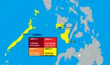 As a tropical depression, Neoguri (Ambo) brought heavy rainfall to many portions of the Philippines, including even Metro Manila.[29] In Cebu City, the precipitation caused flooding, which forced 62 people to evacuate their houses.[30] In the Camotes Islands, rough waves capsized a motorboat with six passengers; five were rescued, with the other reported missing.[31] But the storm at least alleviated for a few days the heat that has been experienced over Luzon from the past weeks.[32] However, the storm did not stop the Palarong Pambansa (National Games in the Philippines) which was held in Puerto Princesa City in Palawan, one of the areas said by PAGASA to see stormy weather.[33]