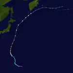 A disturbance close to Japan's coast developed into a tropical depression on August 22, and became a tropical storm 6 hours later. It managed to achieve a minimum central pressure of 999 mbar before it struck the southeastern portion of Japan. It weakened to a tropical depression shortly before landfall though, and became extratropical the next day. But its extratropical remnants continued to move north-northeast, then northeast, and then east-northeast until it dissipated on August 27.