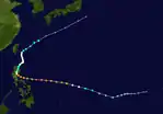 Virginia formed on June 18 in the open western Pacific east of the southern Philippines. It moved west and strengthened to a typhoon on June 20 and reached its peak of 175 mph (282 km/h)and a minimum central pressure of 900 mbar on June 22. Virginia then began to move northwest and weakened to a Category 4 typhoon as it passed east of Luzon on June 23 and June 24. It turned northward on June 24, strengthened to a secondary peak of 160 mph (260 km/h), and weakened before it made landfall in Taiwan on June 25 as a Category 2 typhoon. Virginia then continued to move north and then northeast until its dissipation on June 28.
