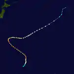 On September 14, in the open Pacific, Elaine was formed. It moved in a generally northwestward direction while gaining strength. Its peak intensity was 140 mph and a pressure of 945 mbar. But it turned sharply to the northeast and lost strength. On its penultimate day as a tropical cyclone, it turned eastward and became extratropical the next day. Elaine's extratropical form continued one more day, and dissipated, one week since its formation, just over the Dateline.