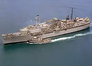 The exchange was completed by mid-January, 1973, and Proteus resumed her duties. In 1974 personnel from the Ship Repair Facility at Naval Base Guam removed the remaining 5-inch gun turret and munitions as unnecessary for her primary mission - leaving only the four 20mm mounts as her main defensive weapons. When Saigon fell in 1975, some 100,000 Vietnamese fled their country and were processed by the U.S. on Guam. In a massive undertaking called Operation New Life,[3] every able-bodied individual who could be spared helped provide facilities to care for the refugees. As part of that effort over 1,000 officers and men from Proteus worked with Seabee construction personnel to erect the refugee tent city at Orote Field on Naval Base Guam, leaving only a hand-picked skeleton crew of individuals aboard to see to her safety and security; as well as handle emergencies from the boats that were in. But for that week, Proteus was out of business as usual - for which the Secretary of the Navy awarded Proteus her second Meritorious Unit Commendation in 1975; and she (along with other participating Navy Units) were awarded the first award of the Navy Humanitarian Service Medal (established by Executive Order January 1977 for actions beginning 1 April 1975).