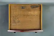 Drawer of chamber desk LXXXVII occupied by Hillary Rodham Clinton in the U.S. Senate. Note signature at center inside of drawer. Chamber desk was once occupied in the U.S. Senate by Al Gore, Sr., father of Al Gore, now used by her successor Kirsten Gillibrand.[10]