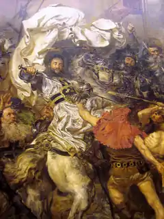 Based on Długosz's description, later generations have imputed Ulrich von Jungingen with hot-bloodedness and arrogance. The painting Battle of Grunwald by Jan Matejko supposedly illustrates the moment when Ulrich, dressed in white with a black cross, trying to attack Grand Duke Vytautas, is killed by two Polish infantrymen, equipped with an executioner's axe and a replica of the Holy Lance reminiscent of the Congress of Gniezno. The tradition was resumed by Henryk Sienkiewicz in his 1900 novel The Knights of the Cross, originally modeled on the measures of the Russian occupants in Vistula Land, describing Ulrich as an impulsive and aggressive commander. The book was made into a film by Aleksander Ford in 1960. On the other hand, 19th century German historiography portrayed Ulrich as a man of chivalric virtues, who succumbed to the cunning of his enemies, as rendered by the author Ernst Wichert in his novel Heinrich von Plauen.