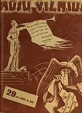 The union published 98 publications,[1] including books, brochures, proclamations, posters, postcards.[10] From 1928, the union published magazine Mūsų Vilnius (Our Vilnius). It was published monthly (1928–1929), every ten days (1931–1933), or twice a month (1930, 1934–1938). Its circulation grew from 8,000 copies in 1931[20] to 72,000 copies in 1937.[10] Its editors were Vincas Uždavinys, Antanas Juška, Petras Babickas. The magazine had up to 40 pages and reported on the conditions of Lithuanians in Vilnius Region as well as other ethnic minorities, primarily Belarusians and Ukrainians, in Poland. The magazine also published poems, theater plays, announcements and reports on the union's activities, caricatures, historical essays, and articles on current political events.[5] The magazine was richly illustrated with images of Vilnius (many by Jan Bułhak), daily lives of Lithuanians in Vilnius Region, views of Grodno, Wigry, Sejny, or Augustów.[4][5]