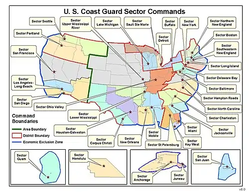 Coast Guard Sectors serve as one-stop-shops for marine safety, security, and environmental protection for major seaports and regions. They bring multi-mission capabilities to life on the front lines of the maritime environment, where Sector Commanders are afforded broad authority.[3]