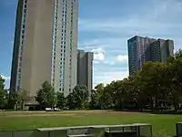 Over the course of 1968 to 1970 and with the assistance of the local redevelopment authorities, Penn acquired, cleared and redeveloped the four-block area between 38th, 40th, Spruce, and Walnut streets. The primary features of this area, which became known as "Superblock", are three high-rise apartment-style dormitories.[25] The key purpose of creating these high-rises was to accommodate 3,500 more students at the university. The whole superblock project and especially the high-rise design were widely criticized,[26] but this view is not held by everyone.[27]