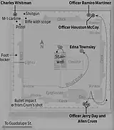 Martinez and Crum were the first individuals to reach the observation deck. Martinez first dislodged the dolly Whitman had wedged against the door before instructing Crum to remain positioned outside the door with his firearm focused to provide cover from their right, and to shoot any individual who appeared in his sights from this southwesterly direction, as he proceeded warily to the left. McCoy and Day separately reached the observation deck shortly thereafter: McCoy immediately followed Martinez to Crum's left; Day—arriving at the observation deck shortly after McCoy—proceeded to Crum's right.[60] Believing he heard the sniper's footsteps proceeding toward the corner of the observation deck he covered, Crum fired a single shot from his rifle into the southwest corner of the parapet, directing Whitman away from his line of fire.[61]