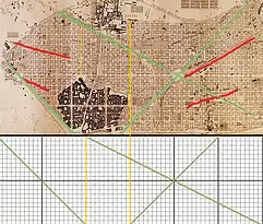It must be taken into account that in many cases the Cerdà plot was superimposed on suburban layouts already existing or under development, in addition to the fact that the towns bordering the city of Barcelona, which would be added in successive phases at the turn of the nineteenth century, had their own urban development projects. Among these layouts we must take into account the highways and rural roads, or the easements imposed by railroads, canals, irrigation ditches, torrents and other land features.[103]
