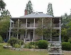 The Utica Mansion is a historic house located at 1103 Bush St. in Angels Camp, California. Built in 1882, the house was originally a two-story stone building designed in the Federal style. Robert Leeper, then owner of the Utica Mine, built the house next to the Utica Mill. Leeper sold the mine to C. D. Lane in 1884; he sold the house to Lane four years later. Lane and two other investors began to buy up mining claims in Angels Camp, and their enterprise soon became profitable. With his investment earnings, Lane began to expand the Utica Mansion. Lane added a two-story addition to the west and north sides of the house and a veranda on the other two sides. He also improved the interior furnishings by adding new wallpaper and fireplaces with English tiles, repainting the woodwork, adding gold moldings to hanging pictures, and installing Axminster carpets. Lane lived in the house until 1895, when he left to pursue an investment in Alaskan mining.[2]