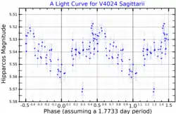 This object is a massive Be star with a stellar classification of B2Ve.[4] The 'e' suffix indicates the spectrum of the star displays emission lines, which are created by materials ejected from the equatorial region of this rapidly rotating star. It is classified as an eruptive Gamma Cassiopeiae variable and has been measured ranging in brightness from visual magnitude 5.34 down to 5.60.[3] The star is an estimated 5 million years old with 8.8 times the mass of the Sun[9] and about 4.5[8] times the Sun's radius. It is spinning with a projected rotational velocity of 105 m/s. V4024 Sagittarii is radiating 7,551 times the luminosity of the Sun from its photosphere at an effective temperature of 18,100 K.[7] Koen and Eyer examined the Hipparcos data for this star, and found that its brightness varied with a period of 1.7733 days.[13]