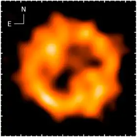![]() The shell of V5668 Sagittarii imaged at 230 GHz with the ALMA. The image has been convolved with a gaussian function to make it match the resolution of the HST at the wavelength of Hα. The major tick marks are separated by 0.1 arc seconds. From Diaz et al. (2018)[1] | |