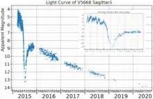 V5668 Sagittarii's peak brightness was followed by a series of fluctuations in brightness, then a strong decline of 7 magnitudes during June as the nova went through a dust formation phase.[4] The light curve for this event is very similar to the DQ Herculis intermediate polar, and it shows a coincident oscillation in X-ray flux with a period of 71±2 s due to rotation of the white dwarf. The white dwarf and its companion star are surrounded by a dusty shell of ejected material.[9]
