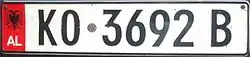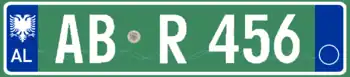 A new format similar to the post-1994 Italian and post-2009 French plate designs has been introduced since 16 February 2011.[1] The plates start with a blue strip at the left with 'AL' and redesigned double-headed eagle in white, 2 serial letters, security hologram, 3 digits, 2 serial letters on a rectangular white background, and end on the right with a blue strip that's supposed to show year of registration and regional code in white on. It has been observed that the last two identification elements are de facto not included while the font is more emphasized than the post-2002 one.[2] Plates of all vehicles would experience a similar change.[3] Critics claim that the color of the double headed eagle and strip is not representative of red and black colors of the Albanian flag.