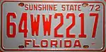 July 1971 – June 1972 | Embossed orange serial on reflective white plate with border line; "FLORIDA" centered at bottom; "72" at top right | "SUNSHINE STATE" centered at top | 1D123456 10D12345 1-123456 10-123456 1W123456 10W12345 10/W-123456 1WW12345 10WW1234 10W/W12345 |