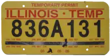 "Responding to complaints that temporary vehicle tags help criminals escape detection, Secretary of State Jesse White announced a $2 million program [on] Tuesday [June 19, 2001] to introduce tamper-proof temporary license plates that will allow police to know the identity of vehicle owners."[44] He also called the black on yellow permit design, "One of the finest devised by man."[46] These tags were the size of regular license plates, they incorporated a hologram in a strip across the entire plate, they had numbers the same size as a regular license plate, and they were immediately entered into law enforcement databases upon being issued. The expiration date was under a clear film to make them tamper-proof. Plates were valid for 90 days, which was the same length as the old system, and only a single permit for the rear of the vehicle was issued. The first day of issue was June 12, 2001 with these earliest permits being distributed to drivers license facilities, auto dealers, and currency exchanges.[44]