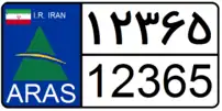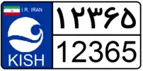 The plate is black on white and consists of a five-digit number written once in Persian digits on the top and in Arabic digits on the bottom. On the left, there is an Iranian flag and the logo of the respective free trade zone with its name written in English below it.