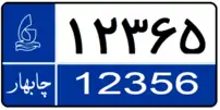 The plate is black on white. To distinguish the type of the plate, there is a wheelchair symbol. The code in the square represents the regional codes. The wheelchair symbol in the plate is fixed for all private vehicles of people with disabilities and these types of plates are issued provincially.