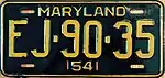 1953–54 | Embossed yellow serial on black plate with border line; "MARYLAND" and "54" centered at top and bottom respectively | none | AB-12-34 | AA-10-01 to approximately JF-65-00 | For each two-letter series, only the letters A through H, and J, were used.[6] |