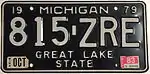 1979–82 | Embossed reflective (glass-beaded) white serial on black plate with border line; "19 MICHIGAN 79" at top. | "GREAT LAKE STATE" centered at bottom | ABC-123 | BBB-000 to ZZZ-999 | Serials BBB-000 through NVM-999 were issued by county.[4][6] Front and rear plates issued until April 1, 1981; only rear plates have been issued ever since. |