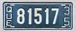 1922 | Dark blue serial on white fiberboard plate; "QUEBEC" centred within dark blue bar at bottom | none | 12345 | 1 to approximately 59000 | |