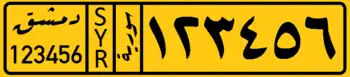 The Syrian license plates since 1997 have black lettering on a white background.[1] The plate is divided into 4 sections (when viewed from left to right):