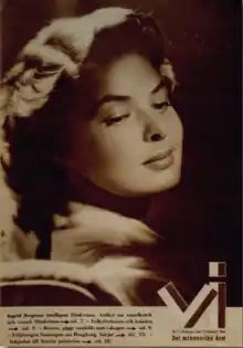 It was retitled Vi (in English; 'We') in 1937,[1] in accord with the adoption of short titles and striking mastheads by the abundance of picture magazines of the era, like LIFE (1936) and LOOK (1937) in the US, Post (1938) and Lilliput (1937) in the UK (1938), and Vu (1928) and Regards (1932) in France,[2] and a corresponding commitment to a house style based on New Typography made by Vi's publisher Kooperativa Förbundet.[3] Rune Hassner writes: