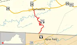 State Route 70 (SR 70) is a primary state highway in Lee County, Virginia, running from the Tennessee state line to U.S. Route 58 in Jonesville. Its continuation in Tennessee, also numbered State Route 70, continues south to the North Carolina state line at North Carolina Highway 208.