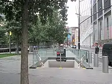 The northern entrance at Vesey Street was under a staircase to the plaza above. After the World Trade Center collapse on September 11, the staircase still stood and became known as the Survivors' Staircase.[41] The stairs were moved into the National September 11 Museum in July 2008.[42]
