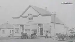 About 1934 John and Mart Sheaffer bought up all of the Co-operative association and became full owners of Panther Store. Rooms above the store, served as living quarters for the manager. The store became a popular place for farmers to congregate. On Saturday afternoons and on rainy days, the hitching racks filled up with teams as folks came for supplies. They bought groceries, dry goods, shoes, tobacco, kerosene, men's overalls and shirts, mittens, canned goods, shucking pegs, ammunition, and candy. Panther served as a produce store, buying poultry, eggs, cream, and butter. They took orders for buggy's, wagons, a variety of farm machinery, fencing materials, and furniture. These orders were shipped to Dallas Center and then hauled out by teams. When cars and trucks came more into use, they were used, instead of horse-drawn wagons to bring supplies from Des Moines. Motorized travel made it necessary to install a gasoline pump.[2]