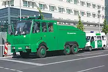 In 2009, the first prototype Wasserwerfer 10000, manufactured by Rosenbauer International AG, was presented to the Bundespolizei. Since then, several federal and state riot police departments have received Wasserwerfer 10000s to replace older water cannons.[9] By 2015, only 34 Wasserwerfer 9000s remained in service, with 6 being operated by the Bundespolizei and the remaining 28 operated by state police forces.[10] Wasserwerfer 9000s have since been gradually decommissioned by most police departments across Germany on safety grounds, with some being donated to fire departments.[8][11]