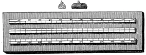 To facilitate the temperature calculation, Wedgwood built a device which would directly read the temperature. Two metal bars with scales on them were fixed one above another on a metal plate and inclined at a small angle. The spacing between the bars was 0.5 inches at one end and 0.3 inches at the lower end. The scale was divided into 240 equidistant parts. The unheated piece of clay would fit the 0.5-inch gap giving the zero temperature reading. After annealing, the clay cylinder would shrink and fit somewhere in between the left and right ends of the bars, and the temperature could be read from the scales on the bars.[4][5]
