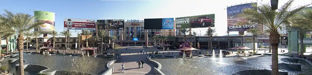 Cooperating with media giant Clear Channel Communications, the development also includes 30 large electronic signs, some in excess of 100 feet (30 m). The agglomeration of electronic signage and media boards, said to be the largest "Media & Signage District" west of Times Square[15] has earned it the nickname "Times Square of the West."[16]