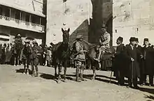After the fall of Beersheba, the regiment was briefly split with C Sqn covering the advance of 53rd (Welsh) Division and A & B Sqns attached to the Australian Mounted Division operating between Beersheba and Gaza. It came back under XX Corps in November. A Squadron was the first formed body of troops to enter Jerusalem after the city had been surrendered to two sergeants of 2/19th Battalion, London Regiment, and the regiment bears the liberation of that city as a battle honour.[15][32]