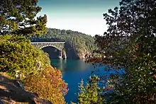 The only bridge that reaches Whidbey Island is the Deception Pass Bridge, State Route 20, which connects the north end of Whidbey to the mainland via Fidalgo Island. Prior to the completion of the bridge in 1935, Whidbey Island was linked to Fidalgo Island by the Deception Pass ferry, which ran from 1924 to 1935. Modern ferry service is available via State Route 20 on the Coupeville to Port Townsend ferry, and via State Route 525 on the Clinton to Mukilteo ferry service on the southern east coast.