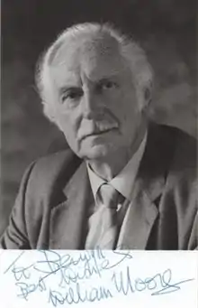 William Aaron Moore (19 April 1916 – 24 April 2000) was an English character actor.[1] He was best known for his role as long-suffering Sydney Lumsden in the popular 1980s comedy series Sorry! (in which he became known for the catchphrase "Language, Timothy!").[2][3] He also appeared in numerous other television programmes, including Coronation Street as Cyril Turpin, Betty Turpin’s husband from 1969–1970.[4] The character put in two more appearances in 1972, then died off-screen in 1974.[5] Moore was married to actress Mollie Sugden from 29 March 1958 until his death.[6] Their twin sons, Robin and Simon, were born in October 1963. Moore starred with Sugden in My Husband and I.[7][8]
