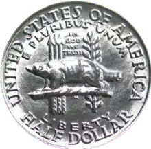 The reverse features a badger, the Wisconsin state animal. Behind it are three arrows, symbolic of the conflict between settlers and the Black Hawk Indians, with an olive branch, marking the peace that paved the way for the establishment of the territory,[29] or, as Anthony Swiatek and Walter Breen put it in their 1988 book on commemorative coins, "the massacre and expulsion of the Indians that made the area safe for white settlers".[28] The name of the country, the coin's denomination, and the inscriptions required by law surround the pictorial design.[29] Hawkins's initial H appears below the badger,[30] which represents Wisconsin's early fur-trading days; both sides of the half dollar emphasize the natural resources of the state.[31]
