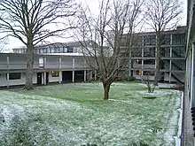 The college owns grounds on both sides of the river, including two meadows on the opposite side, towards Marston.[16] It has a small but well-maintained garden with mature trees behind its main building, and beside the river. The garden is landscaped well on the riverbank, with a flight of steps leading up to a green-house and a sundial. The college also has a smaller garden beside the Robin Gandy building, which stands on the banks of the river.[17]