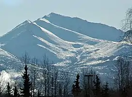Wolverine Peak is a 4,491-foot (1,369 m) mountain summit located in the western Chugach Mountains, in Anchorage Municipality, in the U.S. state of Alaska. Wolverine Peak is situated in Chugach State Park, 10 mi (16 km) southeast of downtown Anchorage, and 2.6 mi (4 km) northwest of O'Malley Peak. It is a prominent mountain on the Anchorage skyline. This geographic feature was so-named in 1963 by members of the Mountaineering Club of Alaska who found wolverine tracks in the snow near the summit.[3] The name was officially adopted in 1964 by the U.S. Board on Geographic Names.[4] A popular hike on a five-mile trail leads to the summit with views of Mount Williwaw, Denali, Mount Foraker, Cook Inlet, and Anchorage.[5]