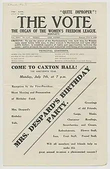 After the creation of the Women's Freedom League in 1907, it grew rapidly throughout Great Britain. The executive committee included Amy Sanderson, Scottish suffragette.[11] The league consisted of sixty branches and had nearly four thousand members.[12] The league established its own newspaper called The Vote.[12] Members of the League who were writers led to the production of the newspaper. The Vote became the primary means of communication with the public, informing readers of campaigns, protests, and events.[12] The newspaper helped to spread ideas concerning the First World War, allowing for the Women's Freedom League to advocate against the war.[12] Members of the League refused to become involved in campaigning efforts led by the British Army. Members were upset when their women’s suffrage campaign came to a halt while the war was in progress.[12]
