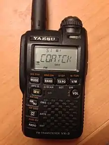 The Yaesu VX-1R is a micro-miniature multiband FM transceiver with extensive receiver frequency coverage intended for use in licensed "Ham" or amateur radio operations. It is purportedly the smallest UHF/VHF hand-held transceiver available, with dimensions of 4.7 × 8.1 × 2.5 cm (1.9 × 3.2 × 1.0 in). It will receive and transmit in both the 2 meter band (144-148 MHz) and the 70 cm band (430-450 MHz). The VX-1R provides receive coverage of the AM and FM broadcast bands, VHF and UHF TV bands, the VHF AM aircraft band, and a wide range of commercial and public safety frequencies.[1]