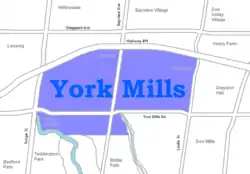 York Mills is a neighbourhood in Toronto, Ontario, Canada. It is centred around Yonge Street and York Mills Road located in the district of North York. In 2010, it encompassed the fourth and seventh most affluent postal codes in Canada.[1] It is recognized as a millionaires' mile, alongside the other Toronto neighbourhoods of The Bridlepath, Forest Hill, and Rosedale.