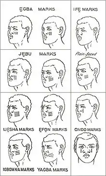 The Yoruba tribal marks are scarifications which are specific identification and beautification marks designed on the face or body of the Yoruba people. The tribal marks are part of the Yoruba culture and are usually inscribed on the body by burning or cutting of the skin during childhood.[1] The primary function of the tribal marks is for identification of a person's tribe, family or patrilineal heritage.[2][3] Other secondary functions of the marks are symbols of beauty, Yoruba creativity and keeping mischievous children alive (ila Abiku). This practice was popular among Yoruba people of Nigeria, Benin, and Togo. During the trans-Atlantic slave trade, tribal identification and facial stripes became important. Some repatriated slaves later reunited with their communities by looking at facial stripes.[4][5]