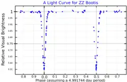 ZZ Boötis is a binary star system, specifically an eclipsing binary.[9] The component stars appear to be of almost equal mass, differing by only 3%.[5]